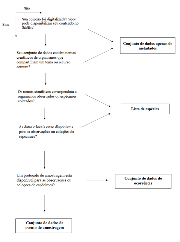 Dados sobre biodiversidade devem ser disponíveis, pesquisáveis e reutilizáveis, conforme os Princípios FAIR. Compartilhar dados com o devido crédito amplia a visibilidade do trabalho, promove seu reuso e fortalece a pesquisa no Brasil. O SiBBr apoia desde a organização até a publicação online dos dados, utilizando padrões internacionais como Darwin Core (DwC) e Ecological Metadata Language (EML). Os registros no SiBBr e no GBIF são organizados em conjuntos de dados, cada um com metadados que respondem: o quê, onde, quando, por quê e como. O conteúdo varia conforme a categoria do dado.